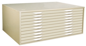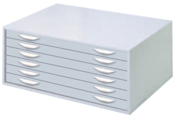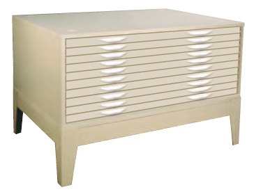 Brownbuilt plan files are available in 6 and 10 drawer configurations with a quality riveted external construction and welded internal support channels for high load capacity. Drawers open smoothly with ball bearing carriage wheels operating on steel tracks, and feature a ramp-stop mechanism to prevent drawers drifting open. Contents are protected in riveted drawer bodies by a hinged front retainer flap and fixed rear hood. Brownbuilt plan file drawers are fitted with two alloy, finger-grip handles to make opening even fully loaded drawers simple. Cabinets are designed with top and bottom nesting domes for safe vertically stacking, and can be ordered with either a welded box stand or raised stand with legs.