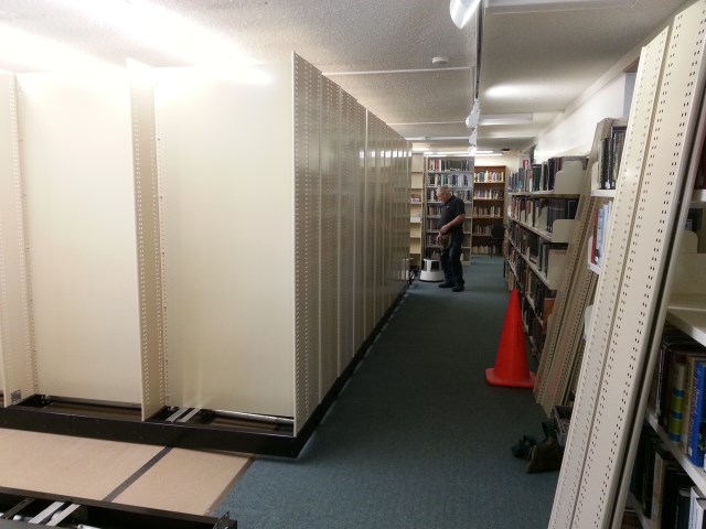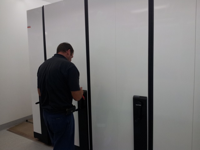 This picture shows one of the rolling filing systems near completion but still surrounded by a construction zone. Carefully taped off, the unit came through without so much as a scratch. |