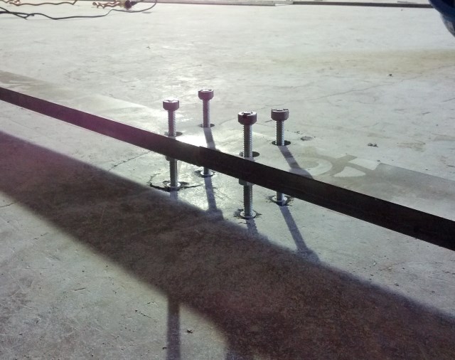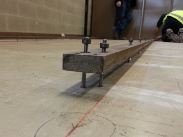 | Once the floor has been marked and straight lined by laser, studs are fixed into the floor to support the track ready for leveling. |