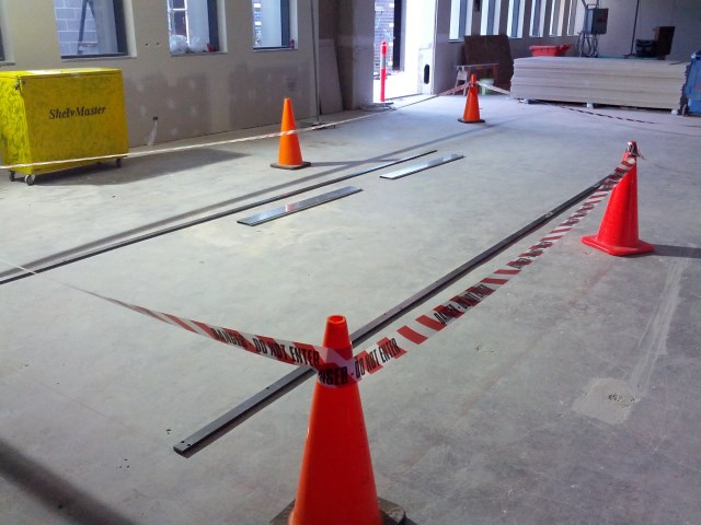 | Installing a track system rolling filing system while the area is still a construction site poses some logistical problems. Taping the area off not only keeps the area clean but is also a safety factor because of the trip hazards present. |