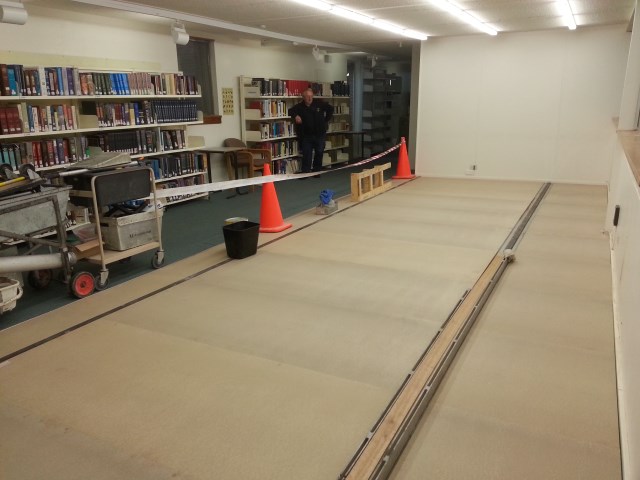 With the floor completed, and the books behind us dust free and safe, time to start building. |