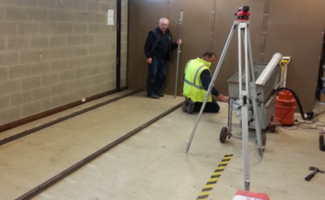 A professional dumpy level is used to find the highest point of the floor. This is where leveling of the track commences. |