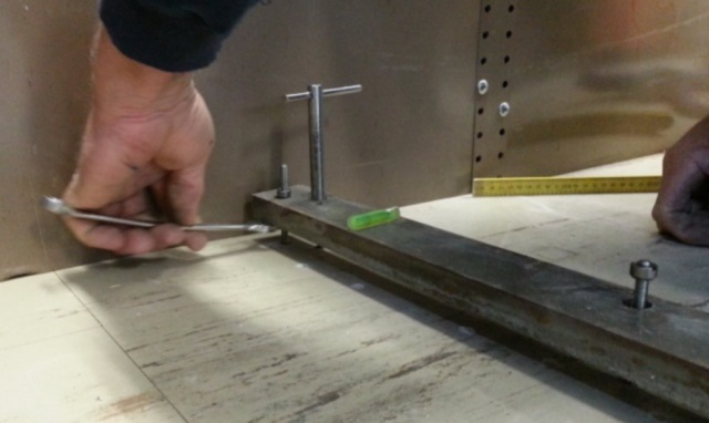 One by one, each upright foot, front and rear is precisely leveled and secured to the ground. |