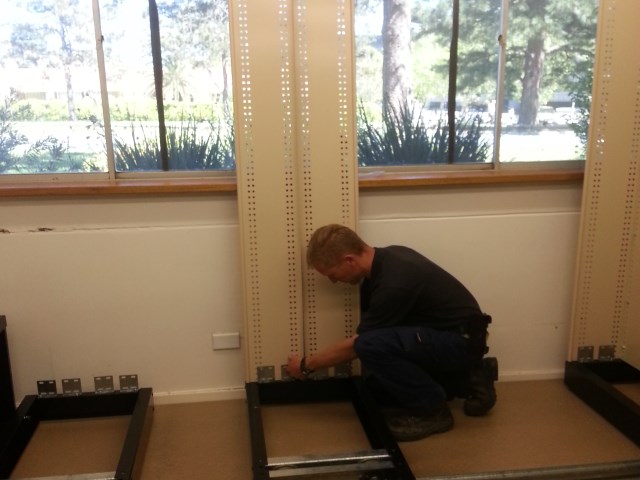 | Before each bay is tightened completely, a centre shelf is put in place to ensure each bay is spread to the optimal distance so as the shelves are not to tight nor loose. |